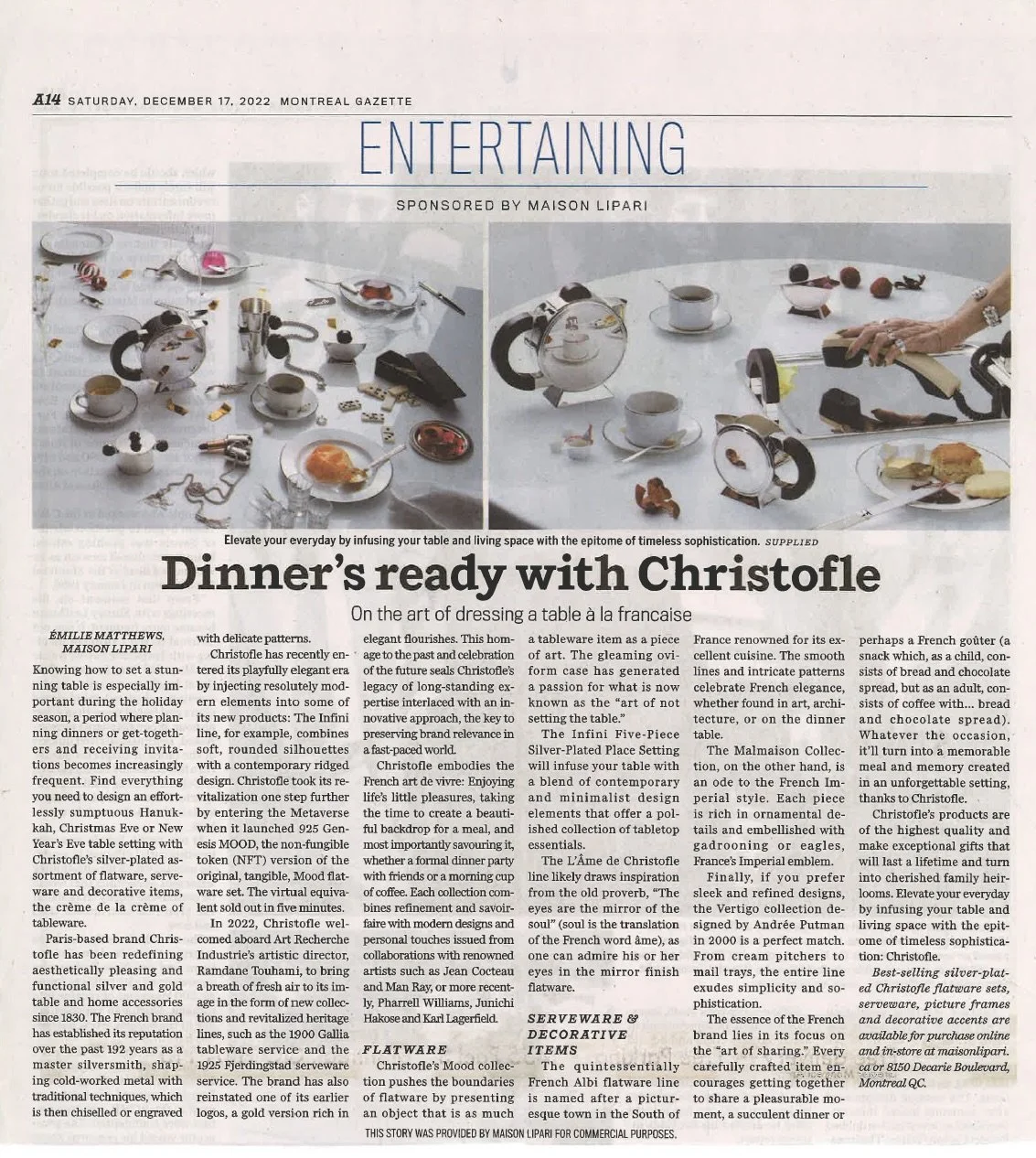Pictured: advertorial in the Montreal Gazette highlighting Christofle’s luxury collection available at Maison Lipari.